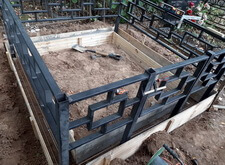 Первым делом мы демонтировали с территории участка кресты и ограждение, параллельно готовя землю к брусчатке. Когда подготовительные работы были завершены мы установили оградке, по низу которой сделали периметр из опалубки для последующей заливки бетоном.