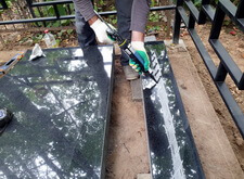 В начале ставим основание надгробья, верхнюю сторону которого промазываем клеем.
